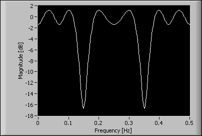 For example, suppose you want to design a double-notch filter with notch frequencies at 0.15 Hz and 0.35 Hz. The five bands in this example have the frequency ranges of [0, 0.12], [0.15], [0.18, 0.32], [0.35], and [0.38, 0.5]. All passbands, single-point bands, and stopbands are equally weighted. The following figure shows the magnitude response of the designed 30th order filter: