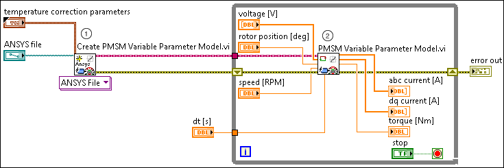 - The Create PMSM Variable Parameter Model.vi reads the ANSYS motor model file to get the motor parameters and data.