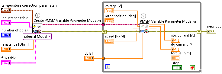 - The Create PMSM Variable Parameter Model.vi imports the external model to get the motor parameters and data.