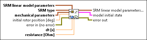 SRM linear model parameters on FPGA returns a reference to the SRM linear model, which you can use to simulate an electric motor on an FPGA target. Use the front panel controls in an FPGA VI to transfer the motor parameters from the host computer to an FPGA target. | ||||||||||||
