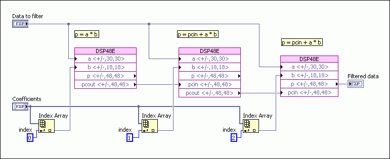 - The p output terminal of the last DSP48E function returns the filtered data. Either create an indicator for this function or wire it to another function.