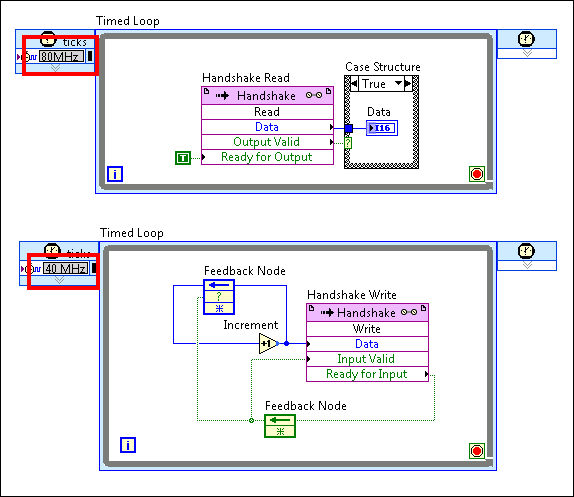 The following block diagram shows how you can read from and write to a handshake item using a Handshake Method Node configured for a target-scoped handshake item. This VI increments a value by one, writes the data to a handshake item, reads the stored value, and automatically acknowledges the read. Input Valid is TRUE when Ready for Input is TRUE. The VI then writes the stored value to an indicator when Output Valid is TRUE. Note that the Write method and the Read method are in two different clock domains, indicated by two red boxes. This design ensures lossless data transfer by writing all data points to the faster clock domain.