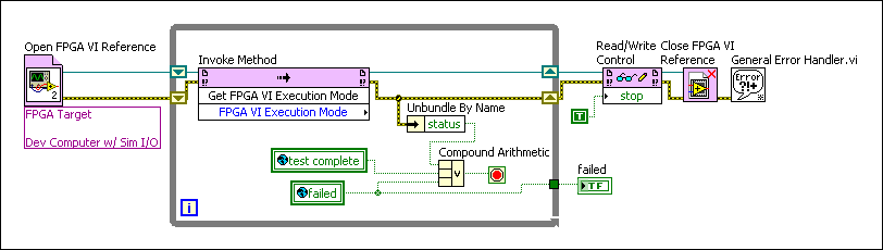 The Test Controller VI opens a reference to the Inverter VI and monitors the execution of the Inverter VI through global variables. After the test is complete or an error occurs, writing TRUE to the stop control stops the Test Controller VI. The Invoke Method configured for the Get FPGA VI Execution Mode method does not impact the execution, but the Invoke Method does provide access to any errors that might occur during execution of the FPGA VI on the development computer.