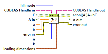 Calculates a symmetric rank-k update of a symmetric matrix. When you wire data to A in and C, this VI automatically selects the first available instance.