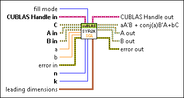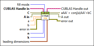 Calculates the rank-2k update of a symmetric matrix. When you wire data to A in, B in (if available), and C, this VI automatically selects the first available instance.