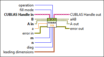 Calculates the triangular matrix expression of the form alpha*op(A)*B or alpha*B*op(A) for triangular matrix A, for rectangular matrices B and C (if applicable), for scalars alpha and beta, and for matrix operation op(X). When you wire data to A in, B in (if available), and C, this VI automatically selects the first available instance.
