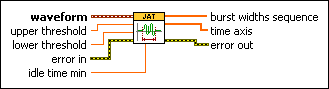 Measures the duration of each burst in a waveform, beginning when an edge in the waveform crosses a threshold level and ending when a subsequent edge crosses another threshold, with a minimum idle region on both sides of the burst. Wire data to the waveform input to determine the polymorphic instance to use or manually select the instance.