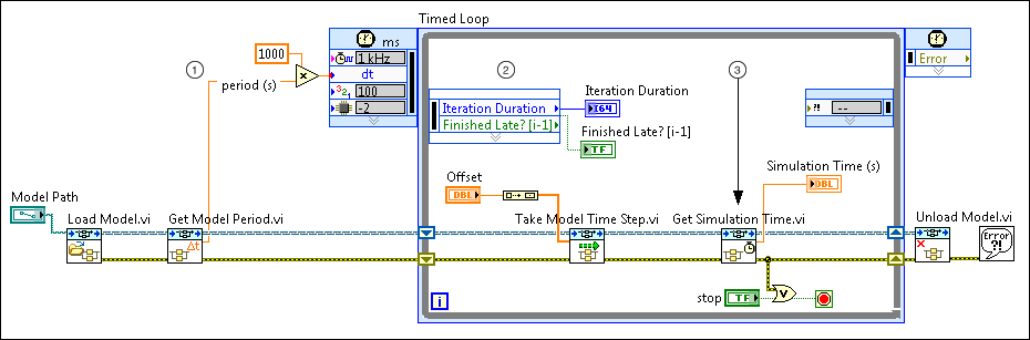 In the following block diagram, each iteration of the Timed Loop must complete execution within the period specified. To calculate the period, the Get Model Period VI reads the compiled rate of the model in seconds. However, the Period input of the Timed Loop expects values in the same units as the 1 kHz clock timing source, so this application converts seconds to milliseconds.