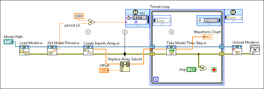 The Take Model Time Step VI requires you to pass an array of inport values to the VI. By creating this array outside the control loop that contains the Take Model Time Step VI, you preallocate the memory and avoid incurring data copies in the control loop, which can cause jitter while the model executes.