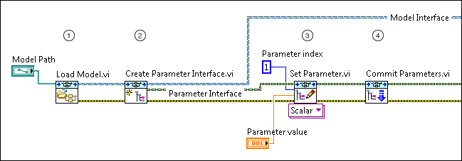 - In your LabVIEW code, use the Model Interface API to programmatically change parameter values at run time. After your code loads a model, you can set an initial value for a parameter, as shown below.
