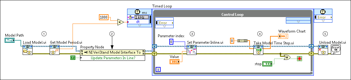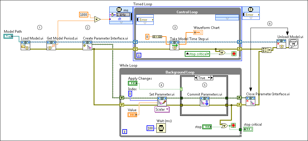 The following block diagram shows the use of a Timed Loop that steps the model at a constant rate and a While Loop that updates parameter values. Both loops run until an error occurs or the stop front panel control is TRUE.