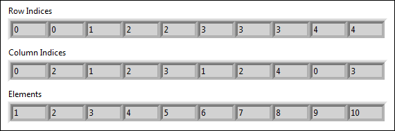 The elements in the coordinate format do not need to be in a specific order. However, a sparse matrix whose elements are sorted according to their row and column indices can potentially perform better during computation. You can use the Reorder Elements VI to reorder the elements in a sparse matrix according to their row and column indices.