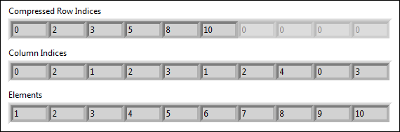 The length of Compressed Row Indices is the number of rows + 1. The elements in Compressed Row Indices must be in ascending order. The first element is 0 and the last element is equal to the number of nonzeros. Let ri denote the i-th element in Compressed Row Indices. Then, the ri-th to ri+1-th elements in Column Indices specify the column index of elements in the i-th row in the matrix. The ri-th to ri+1-th elements in Elements specify the value of elements at corresponding coordinate. The length of Column Indices and Elements is equal to the number of nonzeros.