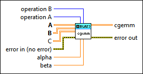 cgemm returns a matrix of the same size as C. For elements of the first M rows and N columns, this VI returns the result of alpha*op(A)*op(B) + beta*C. For any remaining elements, this VI returns the value of the element in C with the same index. | ||||||