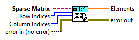 Row Indices specifies the row indices of multiple elements to get from Sparse Matrix. The number of elements in Row Indices must be equal to the number of elements in Column Indices. All elements in Row Indices must range from 0 to the number of rows in Sparse Matrix. |