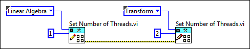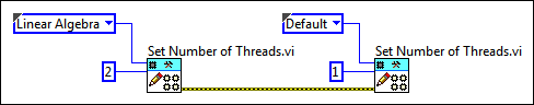 The following figure demonstrates how to specify two threads for linear algebra functions and one thread for all other functions except linear algebra functions. This figure supposes that the VI runs on a quad-core system.