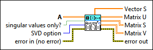 singular values only? specifies whether to compute the singular values only. The default is FALSE. If singular values only? is TRUE, this VI does not compute Matrix U and Matrix V. | ||||