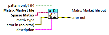 Refer to the Write Matrix to Matrix Market File VI in the labview\examples\Multicore Analysis and Sparse Matrix\Sparse Matrix directory for an example of using the Write to Matrix Market File VI.