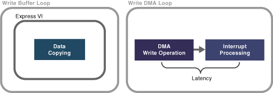 The following figure shows the latency in signal generation when you place a checkmark in the Wait until done? checkbox. Latency refers to the time it takes to complete the data copying, DMA write operation, and interrupt processing.