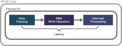 Latency refers to the time it takes to complete an operation. When you use the myRIO Express VIs to acquire or generate signals, latency has different meanings.