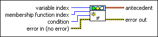 Creates an antecedent, or IF portion, of a rule for a fuzzy system. An antecedent consists of three parts: an input linguistic variable, an operator that specifies whether to calculate the degree of membership or the degree of non-membership of the input linguistic variable within a linguistic term, and a linguistic term.