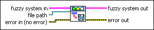 Saves a fuzzy system to a .fs file. You can use the FL Load Fuzzy System VI to load the .fs file you save. You also can load and save .fs files in the Fuzzy System Designer.