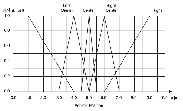 For example, the linguistic variable Vehicle Position x might have full membership (1) within the linguistic term Center at 5 meters, no membership (0) within that term at 4 meters or less and 6 meters or greater, and partial membership at all distances between 4 and 6 meters. If you plot the degree of membership against the value of Vehicle Position x, you can see that the resulting membership function is a triangle function.