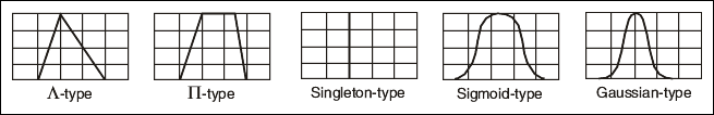 You can apply the normalized standard membership functions shown in the following image to most technical processes. These standard functions include Λ-type (triangular shape), Π-type (trapezoidal shape), singleton-type (vertical line shape), Sigmoid-type (wave shape), and Gaussian-type (bell shape) membership functions.
