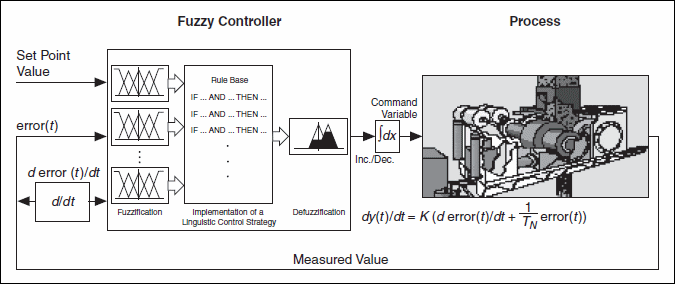 The benefit of the fuzzy-PI controller is that it does not have a special operating point. The rules evaluate the difference between the measured value and the set value, which is the error signal. The rules also evaluate the tendency of the error signal to determine whether to increase or decrease the control variable. The absolute value of the command variable has no influence.