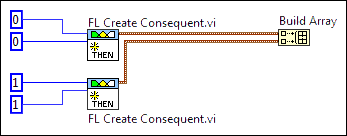 - Wire the consequent output of the second FL Create Consequent VI to the second element input of the Build Array function. The section of block diagram you just created resembles the following image: