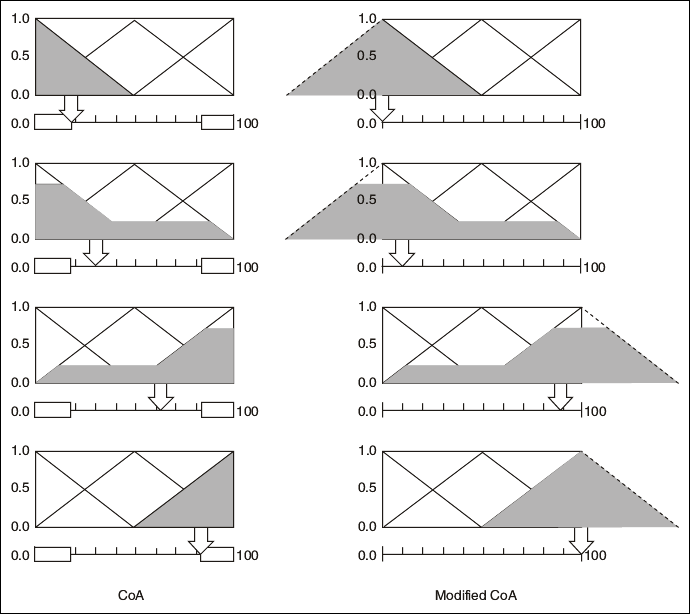 Because the Center of Area (CoA) defuzzification method evaluates the area under the scaled membership functions only within the range of the output linguistic variable, the resulting crisp output values cannot span the full range. To solve this problem, use the modified Center of Area defuzzification method.