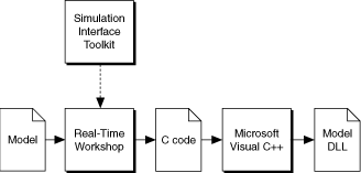 To enable a model to run on an RT target, Real-Time Workshop converts the model and any subsystems into a C code version of the model. Note this C code version of the model is the same Simulink block diagram model, just in a C code form. Microsoft Visual C++ then compiles the C code model into a model DLL named ModelName.dll, where ModelName is the name of the model. Real-Time Workshop places the model DLL into the current working directory. The following figure shows this conversion process.