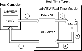 - Driver VI—The VI that manipulates the model DLL. The driver VI and the model DLL run on an RT target. You manipulate the driver VI with a host VI. You create a driver VI using the SIT Connection Manager dialog box.