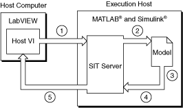 Note Advanced users can create a host VI using the User Interface VIs. - SIT Server—The server that uses a TCP/IP connection to transmit data between the host VI and the model. You must launch the SIT Server, which starts automatically when you launch The MathWorks, Inc. MATLAB® application software, before running a simulation. By default, the SIT Server runs on port 6011.