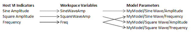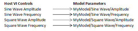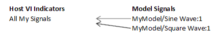 In the previous figure, the Sine Wave Amplitude control of the host VI manipulates the amplitude parameter of the Sine Wave block in the model. The same relationship applies to the rest of the controls and parameters. You also can map one host VI control to multiple parameters and one indicator to multiple signals. The following figure shows this one-to-many relationship, mapping from model signals: