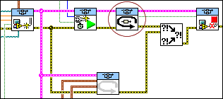The following figure shows these VIs, circled from left to right, on the block diagram of the IO Base Rate Loop VI.