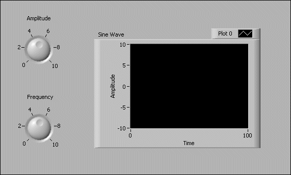 - Add two knob controls to the front panel. Label the first control Amplitude and the second control Frequency.