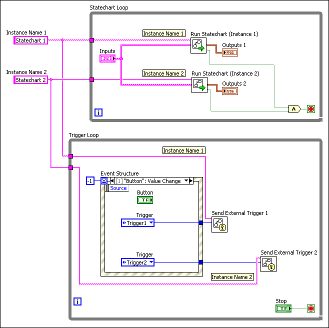 Note This example uses the caller VI to send triggers to an external queue. However, as long as the caller VI is running and the statechart is in memory, you can use any VI to send triggers to an external queue. This behavior means that you can place the Trigger Loop and Statechart Loop in separate VIs. |