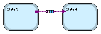 The node is divided visually into three white rectangles. The rectangle on the left, closest to the state that initiates the transition, represents the trigger for the transition. A white rectangle here means the transition is configured to use only the NULL trigger. This configuration is the default for new transitions. A blue rectangle here means the transition is configured to use at least one trigger in addition to, or instead of, the NULL trigger.