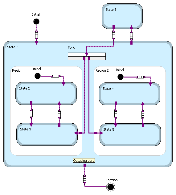 In the previous figure, the statechart enters State 1, which then enters the substates State 2 and State 4 concurrently. The statechart enters these substates because the Initial pseudostates specify that these are the substates to execute first.