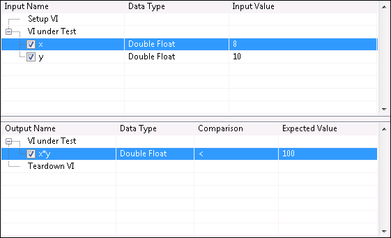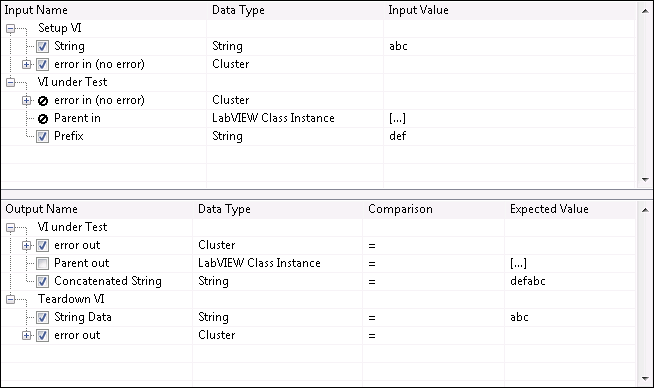 You also can configure the input and expected values of these data types by using setup and teardown VIs. When you configure a test to run setup and teardown VIs, LabVIEW lists the controls and indicators of the setup and teardown VIs on the Test Cases page. You can configure the inputs of the setup VI before passing the data to the VI under test. Likewise, you can configure the outputs and comparison types of the teardown VI after accepting the outputs of the VI under test.