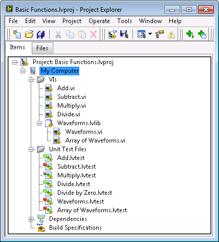 After you execute tests and return to the Project Explorer window, colored dots appear next to the icon of each test you executed. These dots denote whether the test passed (green), failed (red), produced errors (exclamation mark), or was skipped (gray).