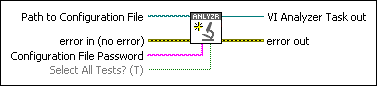 Path to Configuration File specifies the path to the configuration file containing the VI Analyzer task settings you want to use. If you do not specify a path, the VI creates an empty VI Analyzer task. You can use a configuration file you saved through the VI Analyzer or VI Analyzer VIs. |