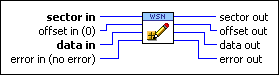 Writes data into a user memory sector starting at the specified byte offset. The offset is advanced by the length of the data. After writing the data, the data is read to verify that the write succeeded. An error code is returned if the write or verify fails. You must manually select the polymorphic instance you want to use.Write to Sector Boolean Array