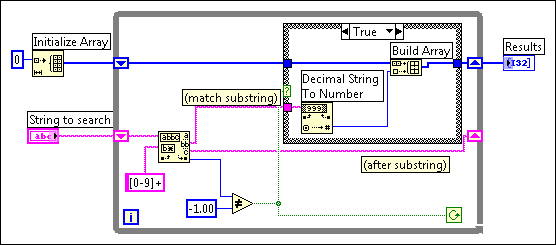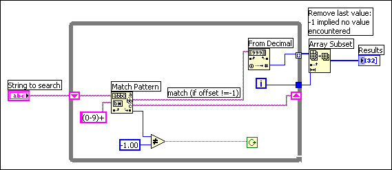 The following block diagram is one method for scanning for all occurrences of integers in a string. It creates an empty array and then searches the remaining string for the numeric pattern with each iteration of the loop. If the pattern is found (offset is not –1, this block diagram uses Build Array to add the number to a resulting array of numbers. When there are no values left in the string, Match Regular Expression returns –1 and the block diagram completes execution.