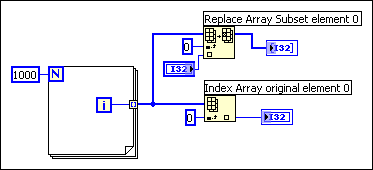 As before, the input branches to three functions. However, in this case the Index Array function does not modify the input array. If you pass data to multiple locations, all of which read the data without modifying it, LabVIEW does not make a copy of the data. As a result, all the data is in-place. This block diagram uses about 4 KB of memory.