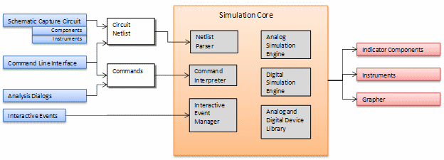 The Analog and Digital Simulation Engines perform the actual calculations in accordance with the analysis specified. The Simulation Methods section provides more details on the internal processes of the analyses.