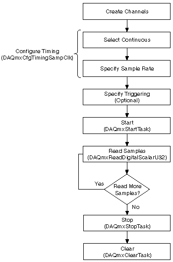 If you want to view, process, or log a subset of the samples as they are being acquired, you need to continually acquire samples. For these types of applications, set the sample mode to continuous. The following flowchart depicts the main steps required in an NI-DAQmx application for acquiring digital signals. You can configure a task for continuously acquiring digital values using the DAQ Assistant.