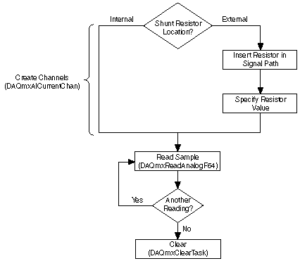 The following flowchart illustrates the main steps required in an NI-DAQmx application to measure current. Alternatively, you can configure a task for measuring current using the DAQ Assistant.