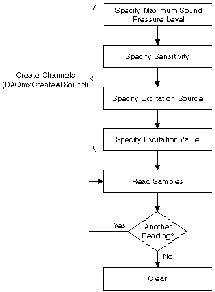 The following flowchart depicts the main steps required in an NI-DAQmx application to measure sound pressure. Alternatively, you can configure a task for measuring sound pressure using the DAQ Assistant.